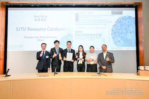 左起:郑庆华(同济大学校长)、蔡诚诚、李鑫(队长)、张婷、方妍、Mahesh Pradhan(联合国环境规划署东亚海洋协调框架主任)项目标题:Photovoltaic-Driven Electrocatalytic Upcycling of PET Plastic Waste Coupled with CO2 Reduction to Coproduce Formic Acid