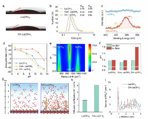 N 1s XPS表明OA-La(OH)3表面的氨基在水溶液中易于质子化为NH3+,同时以磷酸根(H2PO4-和HPO42-)作为拉曼探测pH的信号分子,证明了OA-La(OH)3表面的微碱性环境和氨基在水溶液中质子化。Zeta电位结果也表明OA-La(OH)3含有更高的等电点和更多的正电荷。该电正性的OA-La(OH)3有利于定向富集低浓度电负性磷酸根离子,加速磷酸根离子向吸附剂表面迁移和固定,打破低浓度磷酸根传质壁垒。