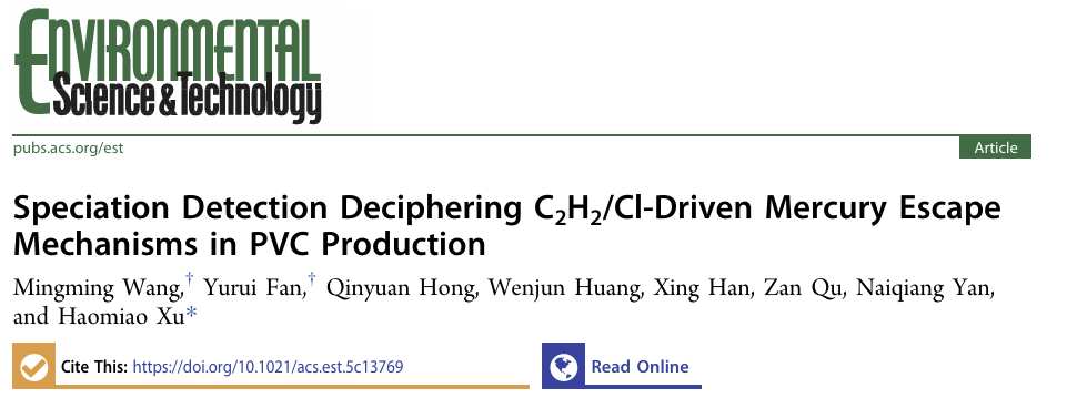 近日,由晏乃强教授负责的在线直播 大气污染控制与模拟研究团队([email protected]),在环境领域著名期刊《Environmental Science & Technology》在线发表了题为“Speciation Detection Deciphering C2H2/Cl-Driven Mercury Escape Mechanisms in PVC Production”的研究成果。2023级博士研究生王明明和博士后范宇睿为论文第一作者,徐浩淼副教授为论文通讯作者。论文第一作者及第一通讯单位均为在线直播-直播av-线上直播 。