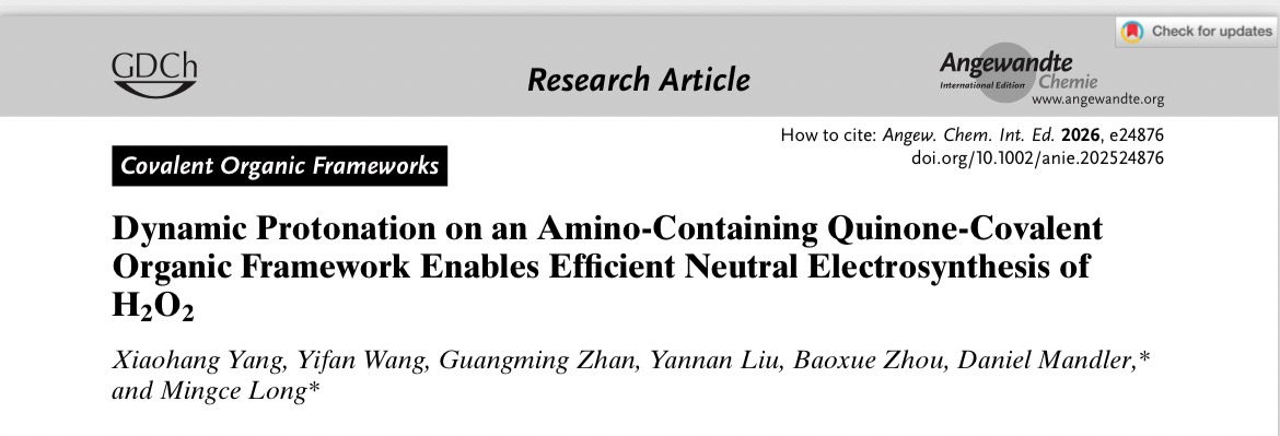 近日,在线直播 龙明策教授在国际顶级化学期刊Angew. Chem. Int. Ed.《德国应用化学》在线发表了题为“Dynamic Protonation on an Amino-Containing Quinone-Covalent Organic Framework Enables Efficient Neutral Electrosynthesis of H2O2。该研究提出了“动态质子化”策略,利用芳香氨基作为高效、动态的质子中继位点,破解了中性条件下质子供给难的问题,实现了醌基介导的高效电催化氧还原合成双氧水。论文第一作者为在线直播-直播av-线上直播 2022级博士研究生杨晓航,通讯作者为龙明策教授和以色列希伯来大学的Daniel Mandler教授,第一完成和通讯单位均为在线直播 。