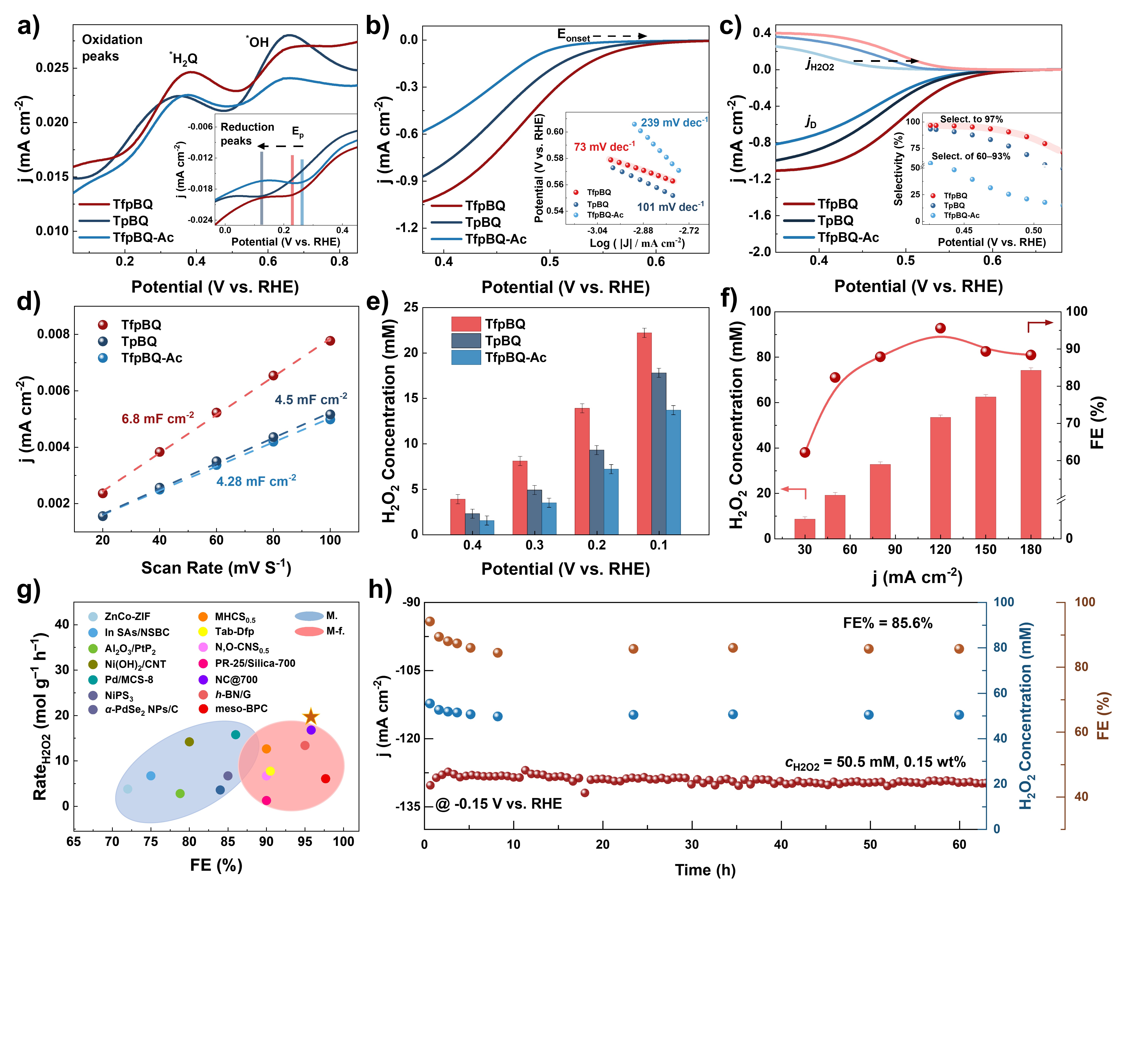 氮气饱和的循环伏安(CV)测试结果显示,TfpBQ表现出最大的氢醌(H2Q)生成量,证明其芳香氨基物种能够高效动态供应质子,从而促进邻位醌位点的氧化还原。氧气饱和的线性扫描伏安(LSV)测试和旋转圆盘-环盘(RRDE)测试证实TfpBQ具有最快的双氧水生成动力学(塔菲尔斜率为73 mV·dec-1)和高达97%的两电子选择性。将TfpBQ负载于气体扩散电极(GDE)并组装流通式反应器,评估了其电合成双氧水的性能。在120 mA·cm-2条件下,TfpBQ实现了19.3 mol g cat-1 h-1的优异双氧水产率,法拉第效率(FE)高达95.6%。此外该TfpBQ在60小时的连续电解期间,表现出卓越的活性和稳定性。