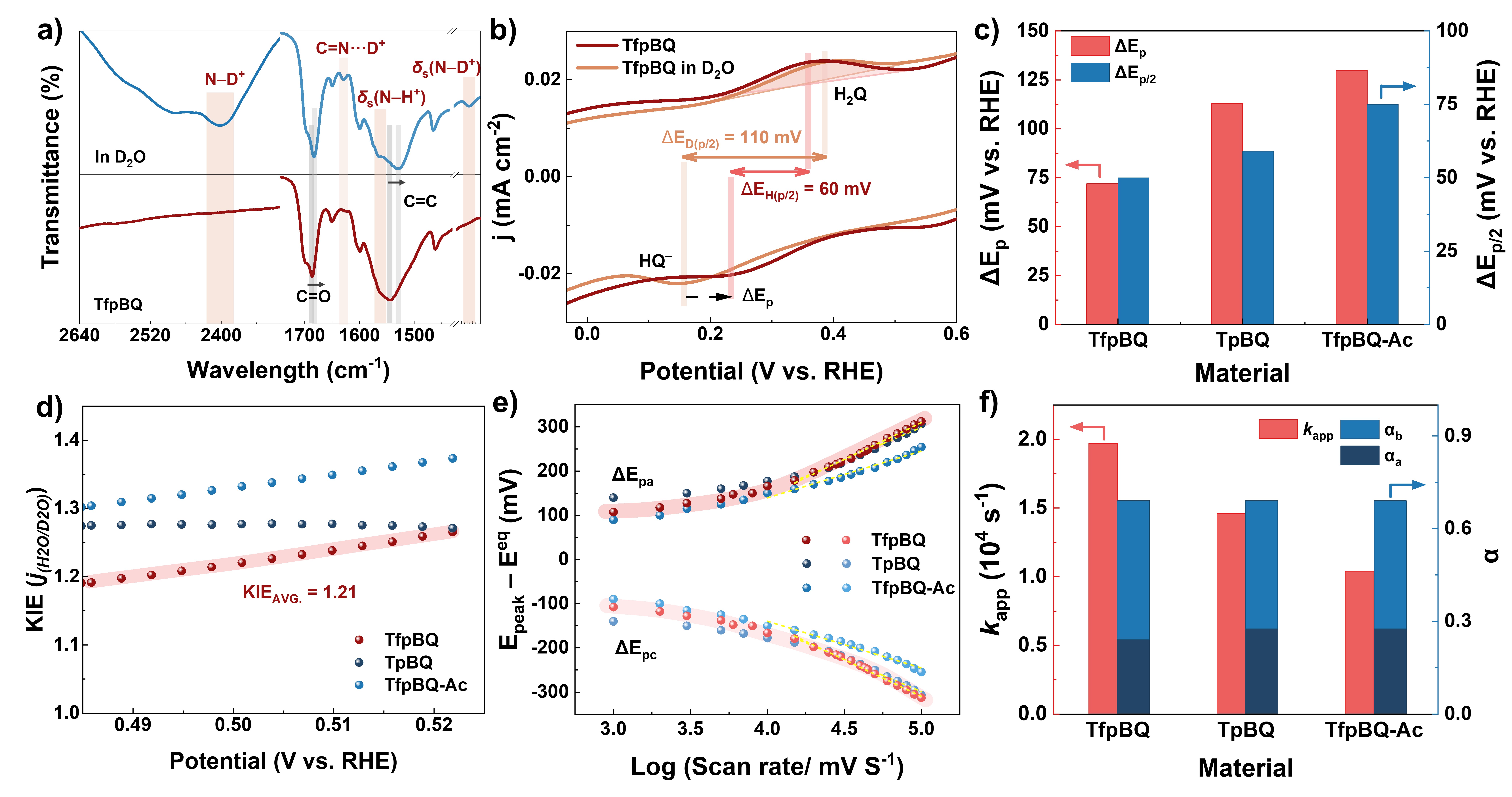结合氘同位素动力学效应(KIE)研究与电化学动力学分析进一步说明TfpBQ中芳香氨基的动态质子化在强化双氧水合成中的关键作用。TfpBQ电极平均KIE值最小,为1.21,表明氨基的动态质子化有效降低了慢速氘转移所带来的动力学势垒。变速循环伏安测试证实TfpBQ具有最大的醌氧化还原表观速率常数(1.97×104 s-1),比不含氨基的Q-COFs提高了42.9%-92.3%。以上结果证实了TfpBQ中的芳香氨基作为动态质子化位点,显著加速了Q/H2Q氧化还原的动力学过程,进而增强其中性双氧水电合成性能。