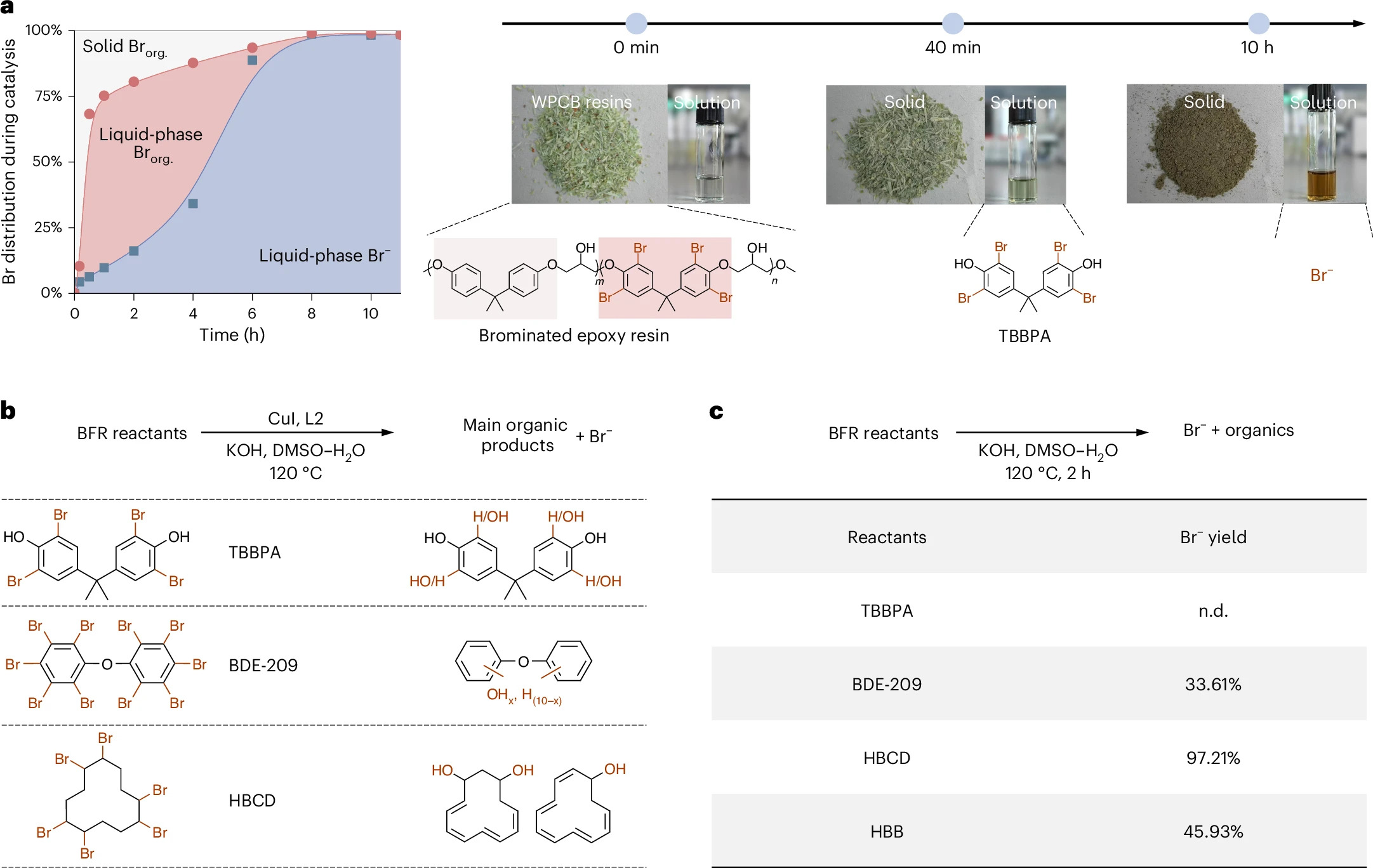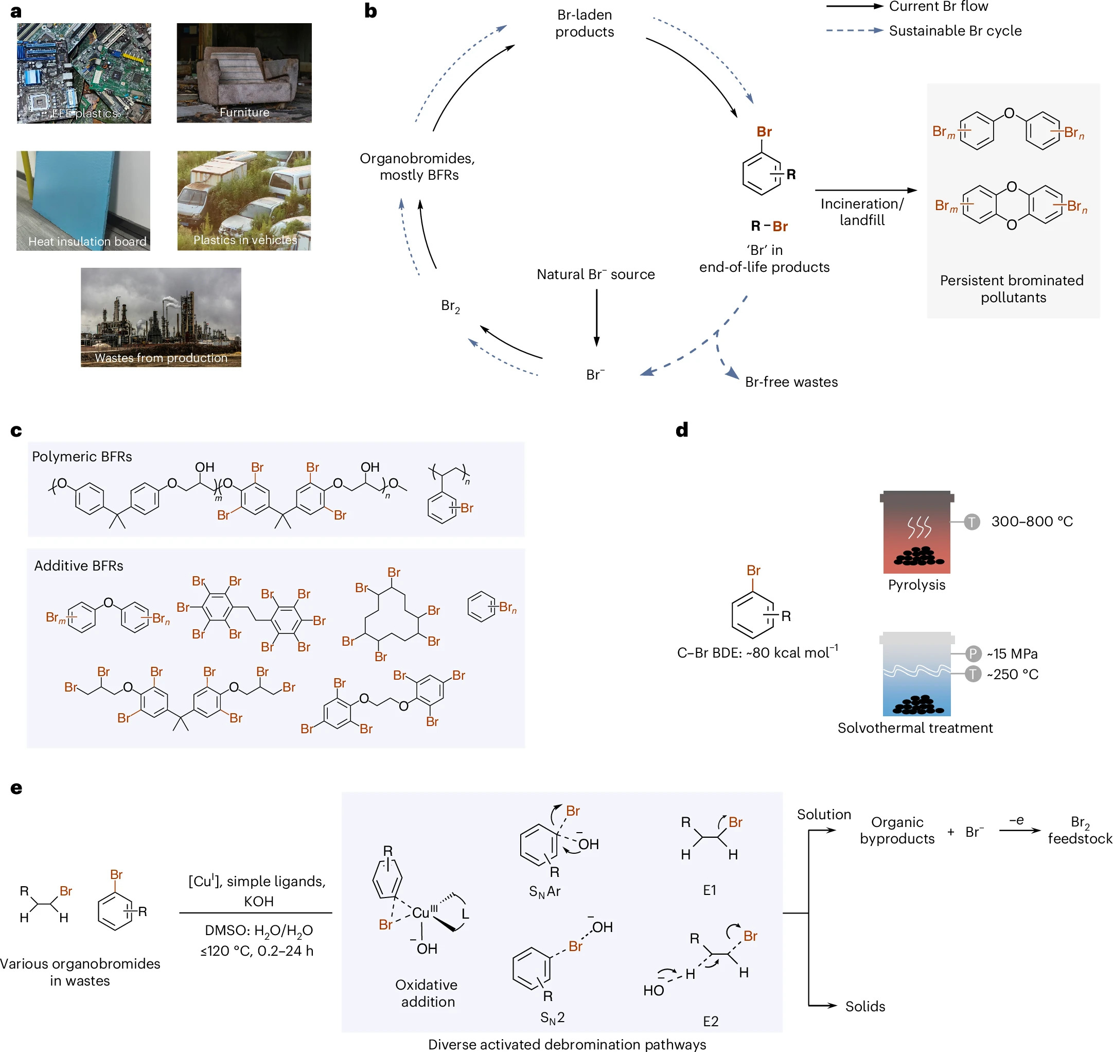 溴(Br)是阻燃剂的关键元素,在电子电器、家具等产品阻燃方面起重要作用。然而,当这些产品被废弃后,溴会以持久性溴化污染物的形式持续释放到环境中,不仅造成严重的环境问题,还导致溴资源流失。该研究针对废弃物中溴形态复杂、C-Br键键能高、难回收的问题,开发了一种基于Cu(I)催化的乌尔曼型脱溴体系,能够选择性地将废弃物中各种有机溴化物转化为溴离子,并能进一步通过蒸发-氧化等过程回收溴素原料。这项工作为溴回收提供了一种可行方法,并有望促进可持续的溴循环。