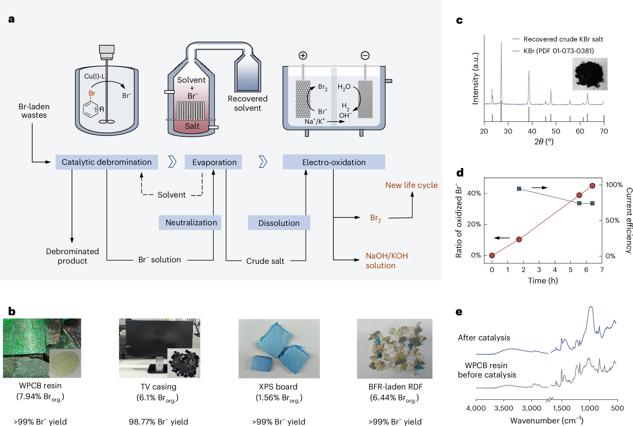 基于所提出的溴催化转化方法,该研究进一步构建了包含“催化脱溴—溶剂蒸发—电解氧化”的溴回收工艺。实验证明,该工艺能够从废弃物回收溴素,回收率可达88-99%,同时脱溴后的剩余固相树脂保留基本化学结构。