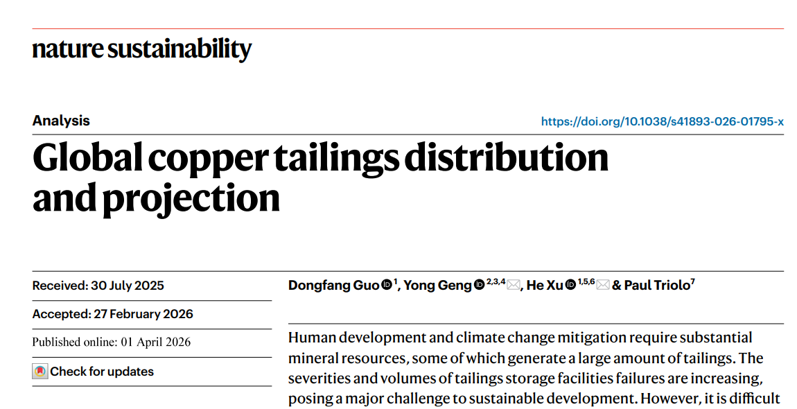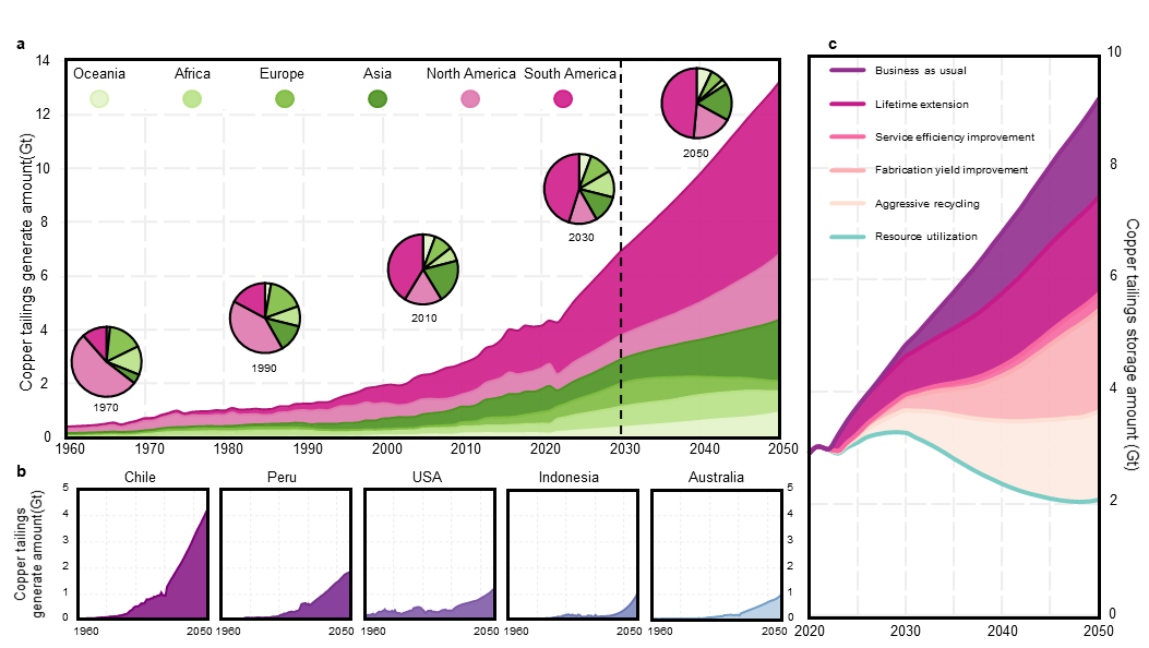 近日,在线直播 耿涌教授与南开大学徐鹤教授团队合作在Nat. Sustain.上发表了题为“Global copper tailings distribution and projection”的研究成果。人类发展和应对气候变化需要大量的矿产资源,而矿产开发过程中产生的大量尾矿正成为全球可持续发展的关键挑战。近年来,尾矿库失事的规模与影响不断加剧。但在全球尺度上,仍难以明确优先治理区域及高效管理路径。本研究聚焦全球主要铜生产国,系统刻画了铜尾矿的时空分布及未来演变趋势。结果表明,在铜需求持续增长和矿石品位逐步下降的双重驱动下,全球铜尾矿产量预计至少在本世纪中叶前仍将持续上升。基于此,研究提出亟需构建系统性、综合性的尾矿治理策略,强化多利益相关方协同,以有效应对日益严峻的尾矿风险挑战。该研究得到国家自然科学基金资助。