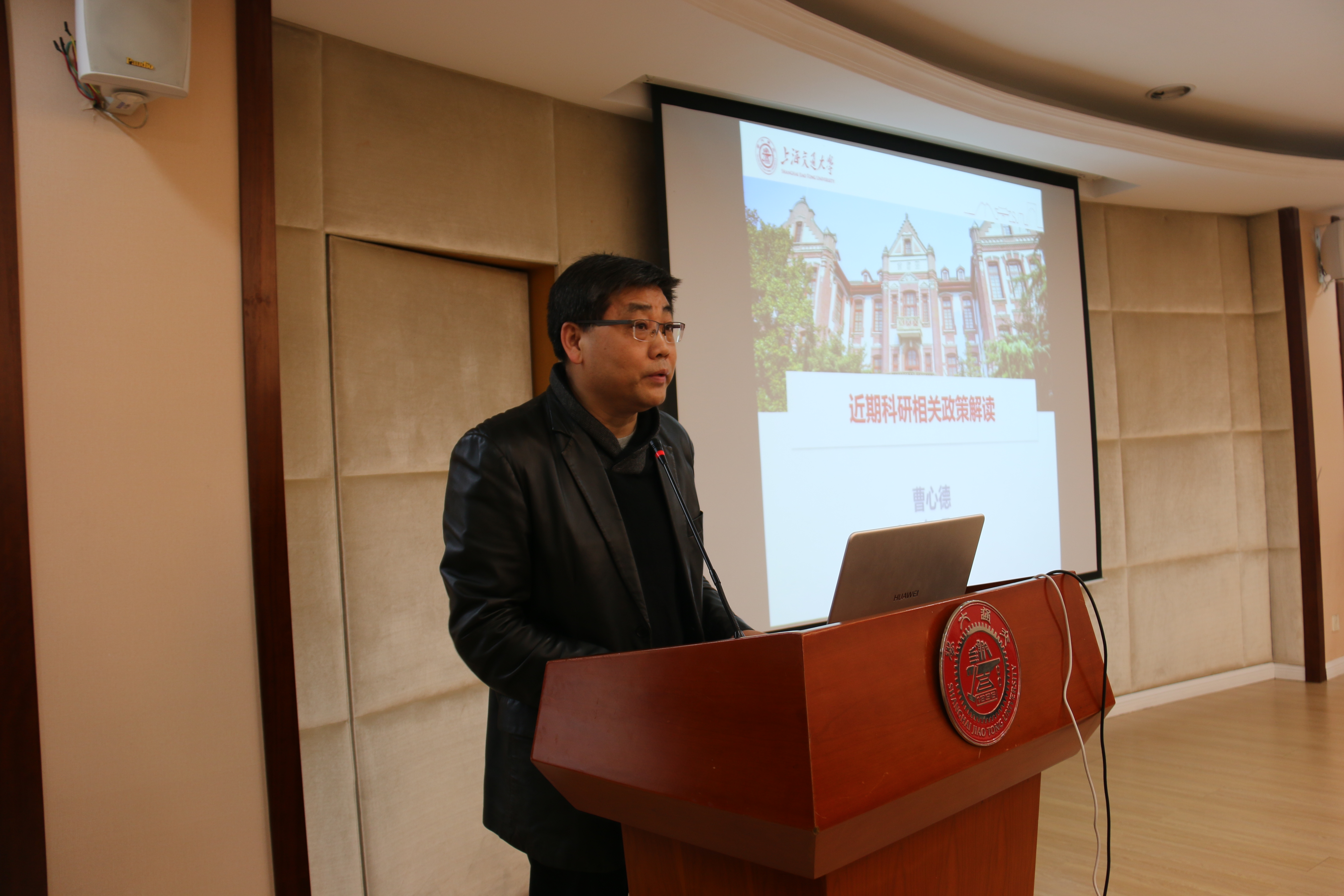 副院长曹心德进行科研相关政策宣讲。曹心德分别从重点思考、工作思路、突出问题、改革举措等角度详细分析了《在线直播 科技工作改革方案(征求意见稿)》、《在线直播 关于承担上海市有关科研项目经费的管理办法》等文件精神。