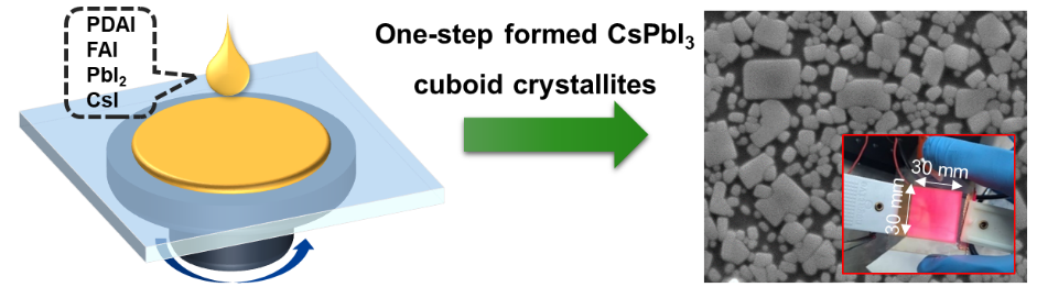 为解决上述问题,赵一新团队报道了通过一步法来原位制备具有长方体微晶结构的三维CsPbI3薄膜。在该工作中,通过引入双胺阳离子,发现将丙二胺氢碘酸盐(PDAI)引入钙钛矿前驱体溶液能显著减缓钙钛矿的结晶速度,提高钙钛矿的晶粒尺寸和结晶质量。PDAI还能在钙钛矿表面形成钝化层,进一步降低了缺陷密度,提升了薄膜的荧光量子产率和器件效率。