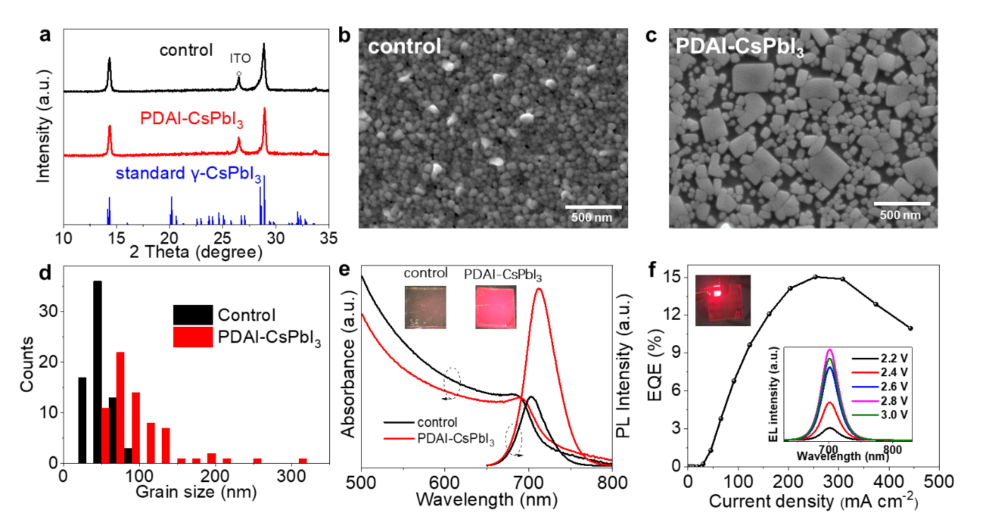相比于有机无机杂化钙钛矿,全无机CsPbI3具有更高的化学稳定性,同时其本征的深红色发光也可以为PeLED显示器提供更宽广的色域。为了克服黑相CsPbI3钙钛矿易发生相变的难题,目前普遍的方法是先将其制备成钙钛矿量子点溶液,再旋涂得到稳定的黑相CsPbI3薄膜。然而量子点表面的有机长链配体会影响钙钛矿薄膜的导电性,使得器件在大电流密度下易发生效率滚降,导致亮度难以提升。相比之下,三维CsPbI3钙钛矿可以通过直接旋涂前驱体溶液获得,并具有更高的薄膜导电性。但是三维CsPbI3薄膜缺陷密度高,导致器件的效率和稳定性难以进一步提升。