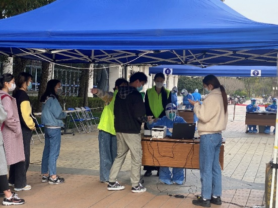 学校全部楼栋封闭管理之后,他主动选择住在逸夫楼的简易起居室,方便后续工作开展。“3月15日那一天,我们三个辅导员负责了东中院接近八千人的封控楼栋核酸检测秩序引导工作,干完之后三个人都因为腿脚酸疼走不动了,只好互相搀扶着走回了逸夫楼。”疫情面前,不畏艰险、逆风而行,他用自己的行动感染着身边的同学。