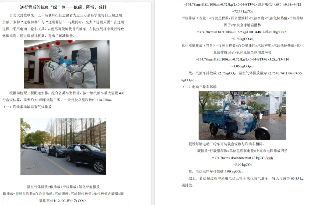 抗疫期间,学生党员充分利用专业优势,拿起“低碳低废武器”投入到“战斗”中。他们自行分组,分别就电动三轮车低碳环保、减少宿舍饭盒量、医疗废弃物处置等三个主题迅速展开讨论,聚焦校园疫情防控中的环保问题,通过核算对宿舍废弃饭盒提出减量化措施意见,并以交大电动车代替汽油车送餐这一实际情况为出发点,测算每日碳减排量。整个过程中,大家分工明确,有效利用网络搜集信息,或查阅书籍及相关科学文献,并咨询程金平教授,与学工办老师一起戮力同心,力求从专业层面做到精准分析,从低碳环保宣传方面做到通俗易懂。无论是从问题的研究分析,还是到汇总、草拟编写,再到成果展示,体现了环境学子的专业素养和使命担当。党员们最后将研究成果形成了两篇建言,希望能够为交大校园内低碳低废绿色抗疫贡献力量!